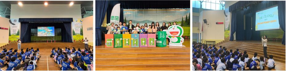 To celebrate globally recognised environmental days, we organize exciting programs during assembly. We collaborate with partners such as NParks, Uniqlo, Apeiron Bioenergy, and the Singapore Food Agency to enhance students' understanding and awareness of biodiversity issues. Our focus extends beyond awareness to seed actionable change for sustainability, circular economy practices, and meaningful actions in support of a greener future.