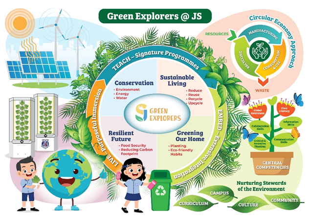 “Green Explorers @ JSPS” is Applied Learning Programme (ALP) that focuses on sustainability through four themes – Conservation, Sustainable Living, Resilient Future, and Greening Our Home. The signature program aims to nurture eco-stewards who responsibly use resources and protect the natural environment through sustainable practices. Anchored in circular economy knowledge, sustainability concepts, and initiatives are integrated across subjects, providing platforms to engage students in sense-making and fostering deep learning to seed actionable change.